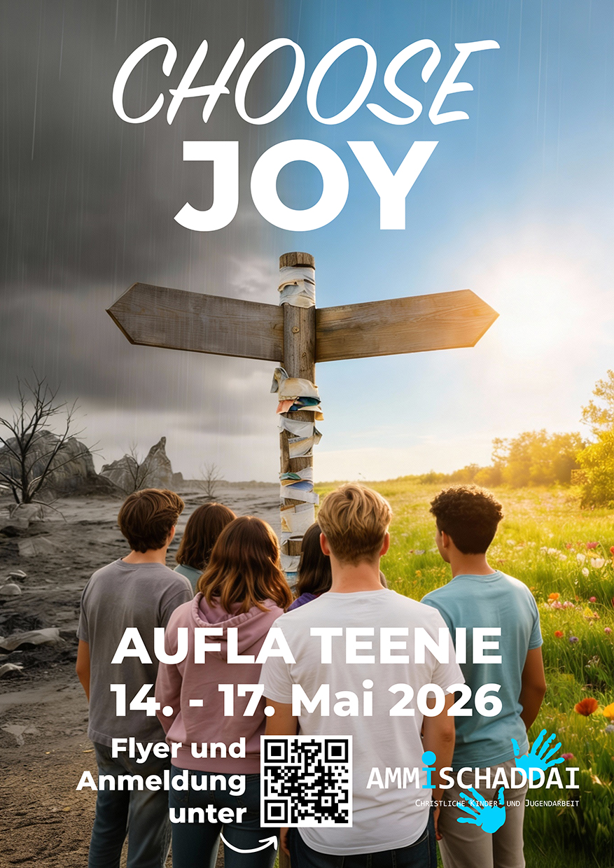 Ab der 7. Klasse bis ca. 2 Lehrjahr bist du bei den Teens voll dabei. Die Teens sind im Pfadiheim Weiermatt, Köniz unter dem Thema „Choose Joy“ - Spass, Action und Deep Time ist garantiert. Flyer mit weiteren Informationen und Anmeldung findest du unter: www.ammischaddai.ch. Wir freuen uns auch Dich!